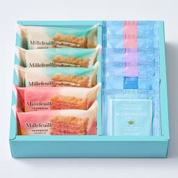 ●国産小麦100%のパイ生地に、バニラとフランボワーズの2種のクリームをサンドしたミルフイユと、ウェッジウッドの紅茶4種をセットにしました。サクサクのパイと風味豊かなクリーム、そして紅茶の芳醇な香りが口の中に広がる、贅沢なティータイムをお楽しみください。